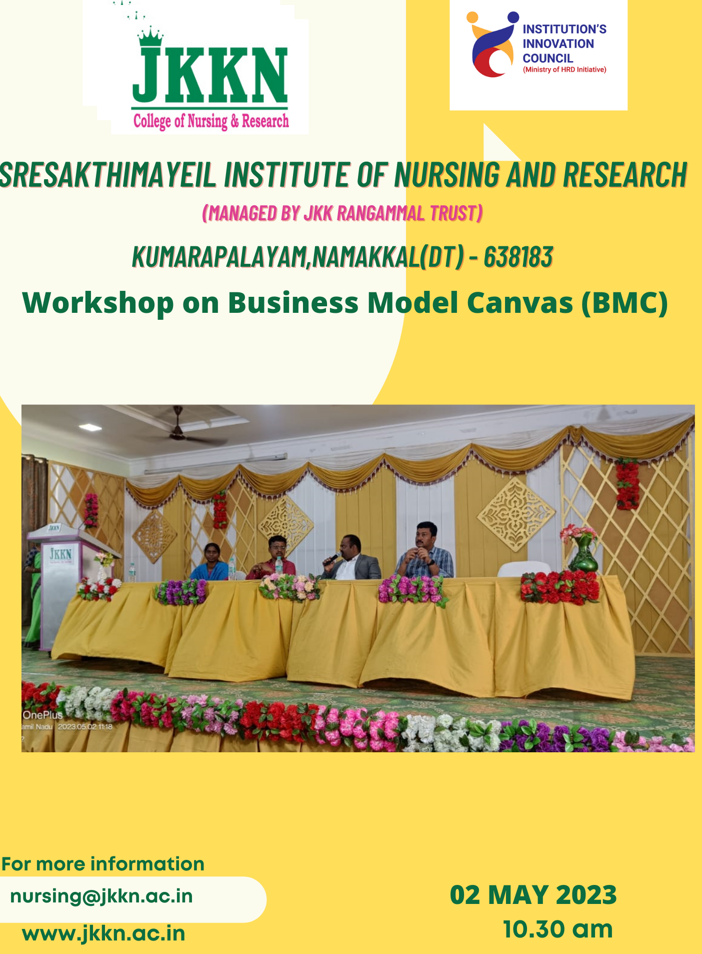 of Nursing and Research (JKKN Educational Institutions) organized a Workshop on Business Model Canvas (BMC) on May 2nd, 2023, at 10:30 AM. The resource person for the session was Mr. Vivek, the proprietor of Shamyuktha Pharma and Managing Director of Lemurik Health Care Pvt Ltd, Chairman of Bhavani Medical Centre and Care one Medical Care Private Ltd. The session started with a prayer song, followed by a welcome address given by Dr. Elanchezhiyan S, the Principal of JKKN Dental College and Hospital. A total of 150 BSC(N), Nursing, AHS, and Dental students and 10 faculty members participated in the session. Mr. Vivek explained the idea of constructing a value proposition canvas, building a business model canvas, and framing an environmental map, including customer segments, value proposition, customer relationship channels, and cost structure. The students actively participated in the session and gained knowledge on the Business Model Canvas. A discussion session was conducted, and the session concluded with a vote of thanks by Mrs. Srinaina, a Physician Assistant in the AHS department.